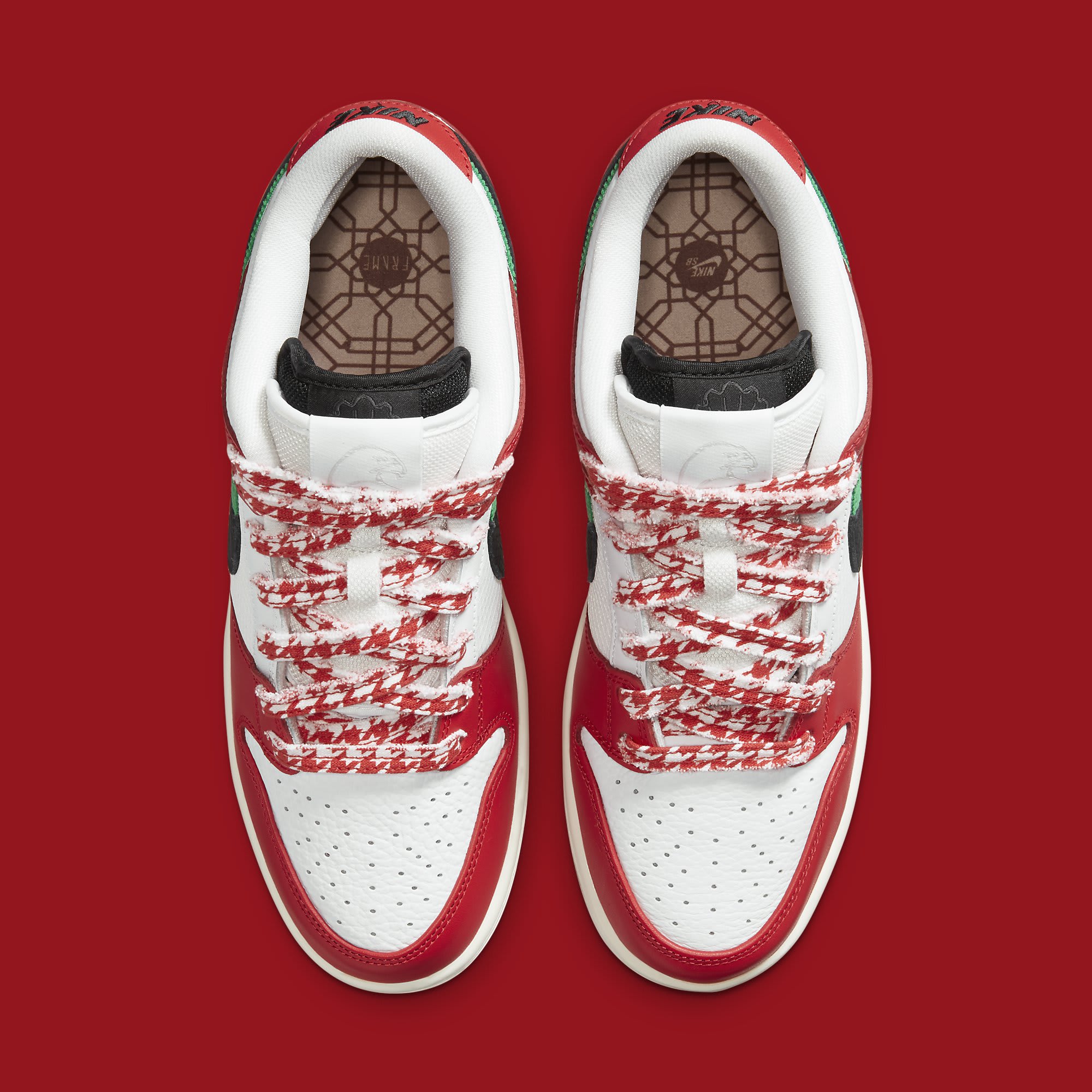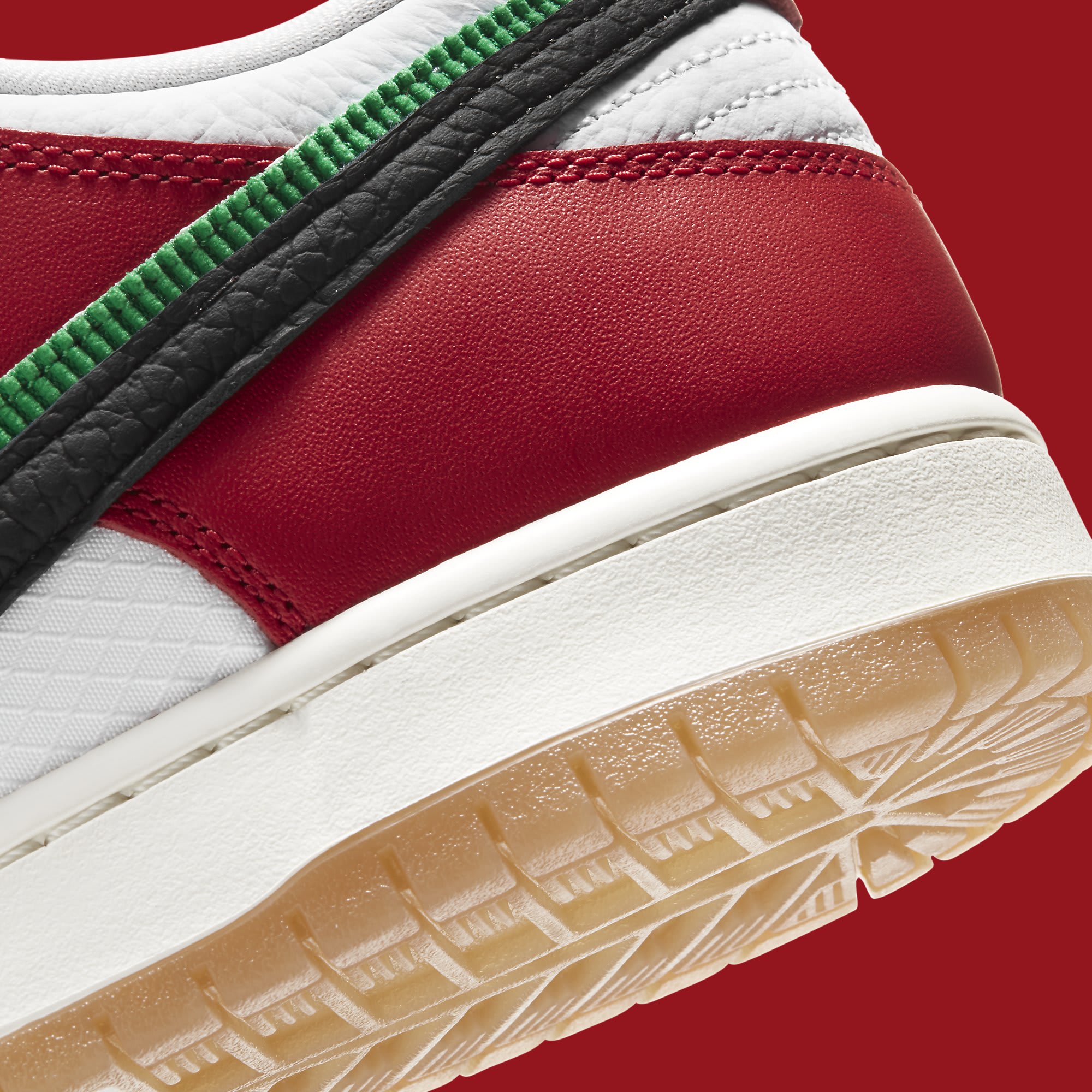 A first look at the Frame Skate x SB Dunk Low "Habibi" was shared by @solebyjc this week, revealing a scheme that appears to celebrate the skate shop's origin, with the hues reminiscent of the United Arab Emirates flag. The white-based leather and mesh upper is paired with red overlays, while overlapping black and green Swooshes appear on the sides. The look is completed with a sail-colored midsole and a gum outsole.
