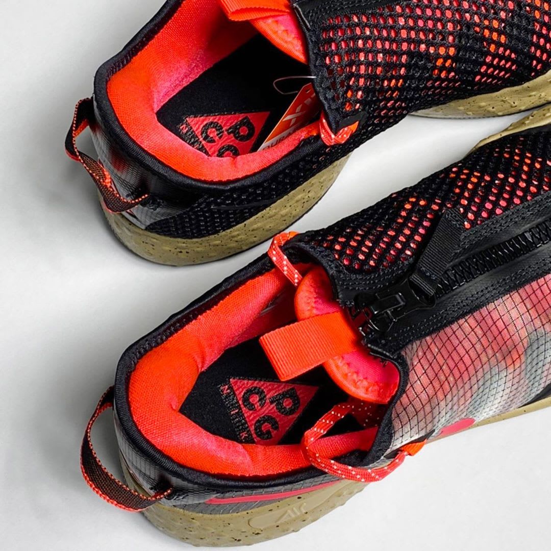 Pulling from the heritage of Nike's All Conditions Gear range, the shoe blends vibrant and earthy tones—red and black share the outdoorsy ripstop and mesh upper, noticeably contrasted by a speckled golden brown midsole. The standout feature on the shoe is the remixed ACG logo, which now reads "PCG," fitting because those are actually George's first, middle, and last initials.