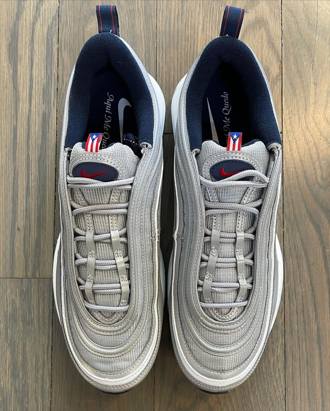 The sneaker itself is a rework of the original “Silver Bullet” Air Max 97 colorway. It features a silver reflective and mesh with the model’s signature radial lines and adds the Puerto Rican flag to the tongue loop as well as the outsole. It also appears that the sneaker will swap its traditional black accents for a dark navy blue.