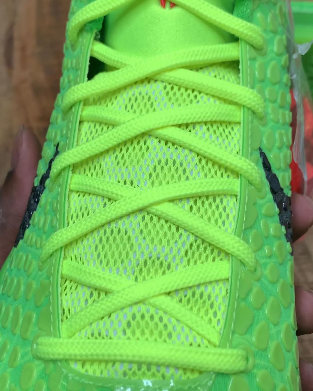 UPDATE (11/20): zSneakerheadz and Sniperkicks32 have shared a detailed look at the "Grinch" Kobe 6 Protro, which reveals that the upcoming release will include red shoelaces similar to the 2010 version. Official release details for the shoe have not been confirmed by the brand, but we'll keep you updated if anything changes.
