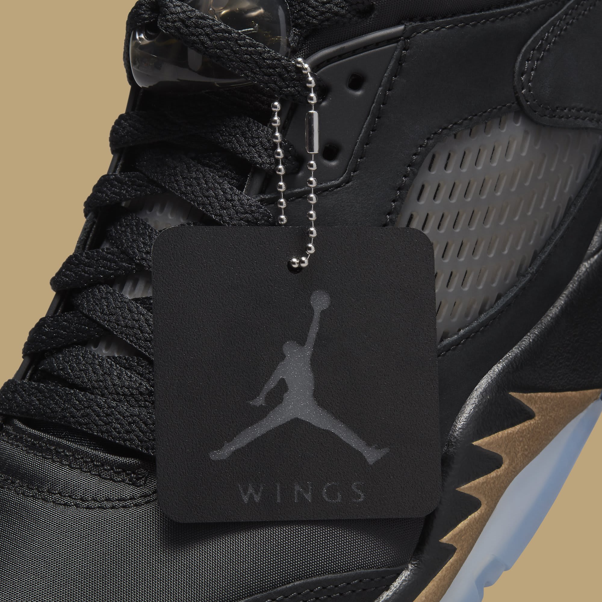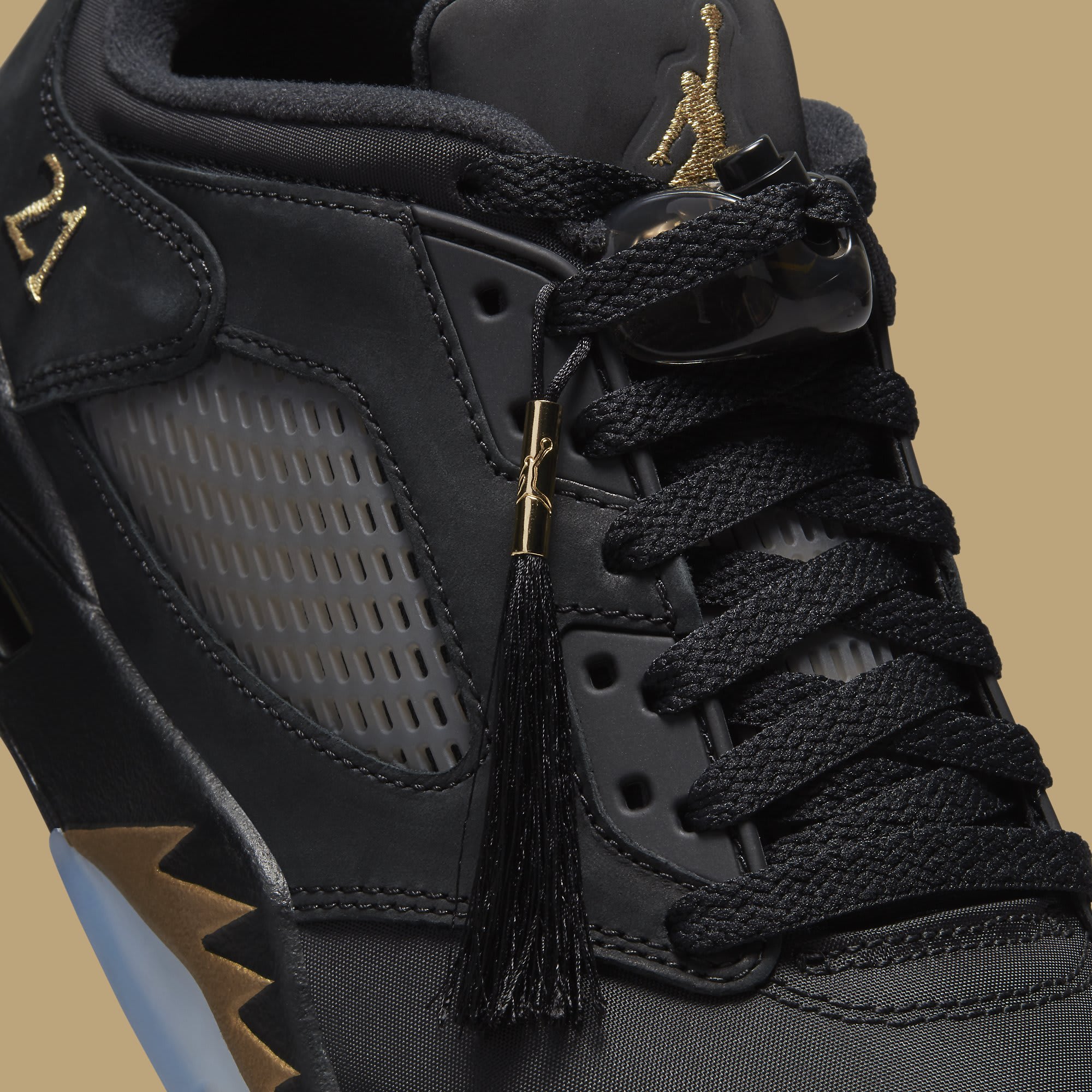 Official Nike product images have leaked of the new Air Jordan 5 Low Wings style said to be nicknamed “Class of 2020-21.” The pair dons a predominantly black color scheme but is contrasted by metallic gold hits on the tongue’s Jumpman branding as well as the “20” and “21” embroidery on the shoe’s heel counter as a reference to the graduating class. Unlike traditional Air Jordan 5 releases, the shoelaces are revamped to mimic the graduation cap’s tassel. Wrapping up the otherwise simple execution is the wings graphic covering the translucent outsole.