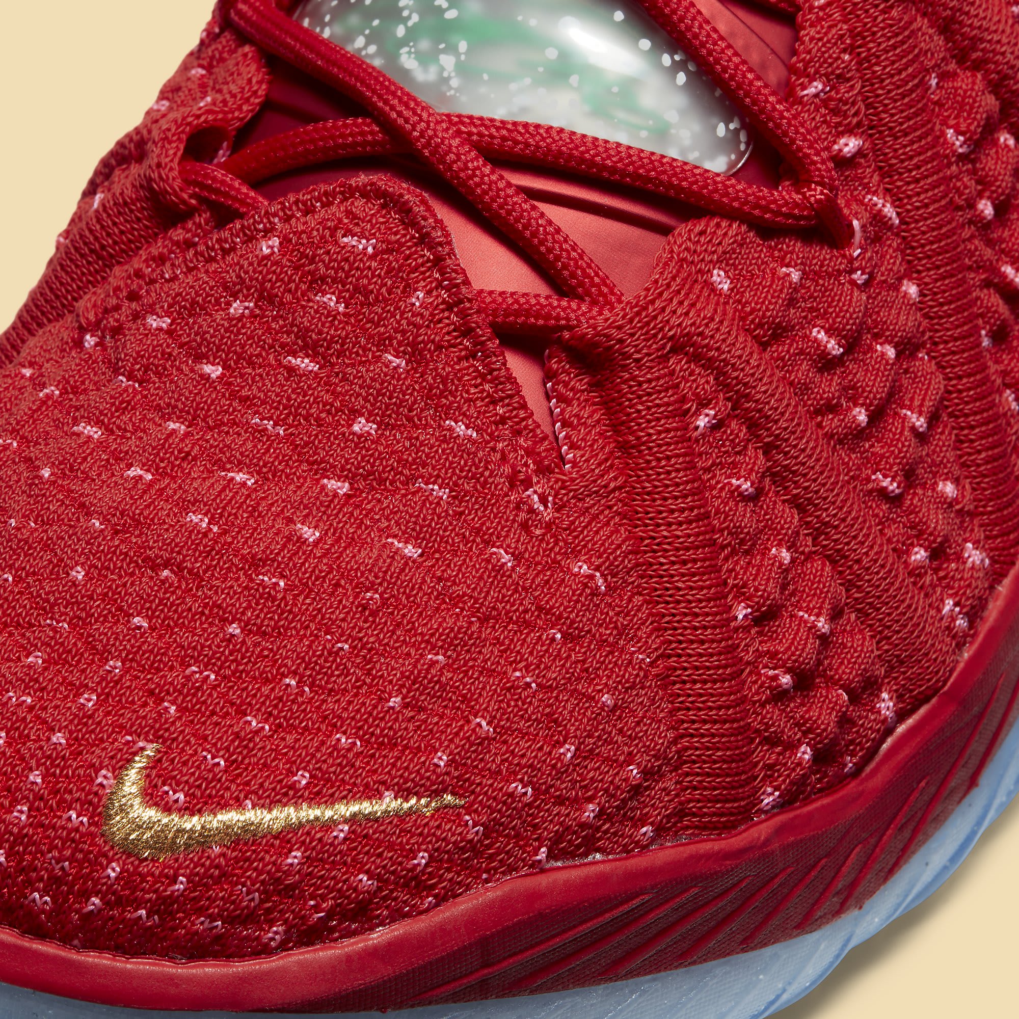 James laced up the 'X-Mas in LA' colorway of the Nike LeBron 18, taking on a traditional red-based look with subtle green and metallic gold accents. The "snow" speckled midsole is reminiscent of Christmas LeBron releases of the past and LeBron-inspired ornaments adorn the insoles. Icy blue-tinted translucent soles cap off the festive look.