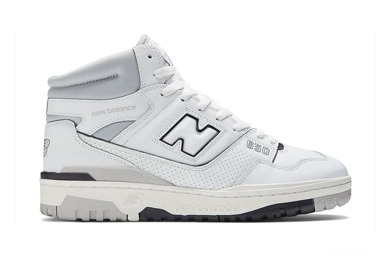 The New Balance silhouette sees the shoe arrive in a n all-white leather base featuring the signature "N" logos on both sides, outlined in black. The 650 labels is seen on the lateral side near the toe box. Additional branding is also on the tongue tags and heels, while "NB" logo is etched in full on the ankle collars. Shades of grey appear around the ankle collars, while a subtle accent is seen on the midsoles. The silhouette sits atop a black, grey and white midsole to round out the design.