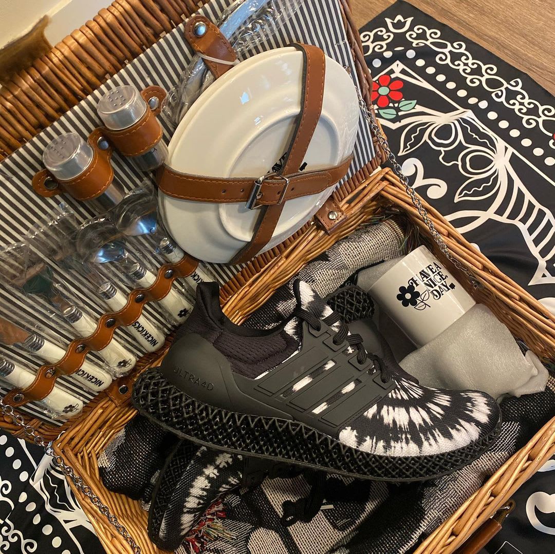 Previewed by designer Franklin Cooke, the runner is styled in black and white and features a tie dye graphic print that harkens back to Nice Kicks and Adidas’ past NMD and Ultra Boost projects. A black 4D printed midsole continues a fairly simple motif, a noticeable detour from their previous work together. According to Cooke, the shoe is dubbed “Have a Nice Day” and is a nod to “enjoying the elements during these confining times.” To further push that concept, friends and family pairs are packaged in a picnic basket with outdoor dining accessories.