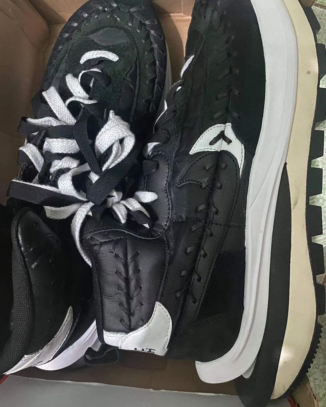 Appearing on leak account @sneakerjamz_new today is a three-way collaboration between Jean Paul Gaultier, Sacai, and Nike. The project appears to continue where Sacai and Nike had left off on the dual-soled Vaporwaffle model, but adds new touches from the French designer which include a mid-cut height and baseball glove-style stitching (appearing in both white and black variations) throughout the upper. Jean Paul Gaultier's signature stripe motif covers the shoe's insole.