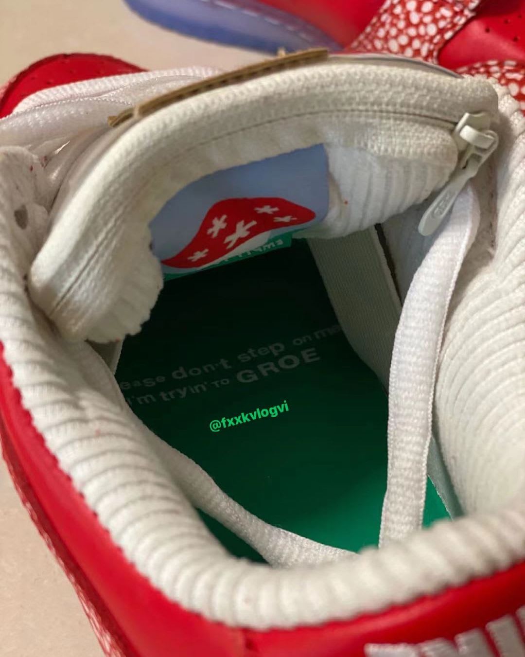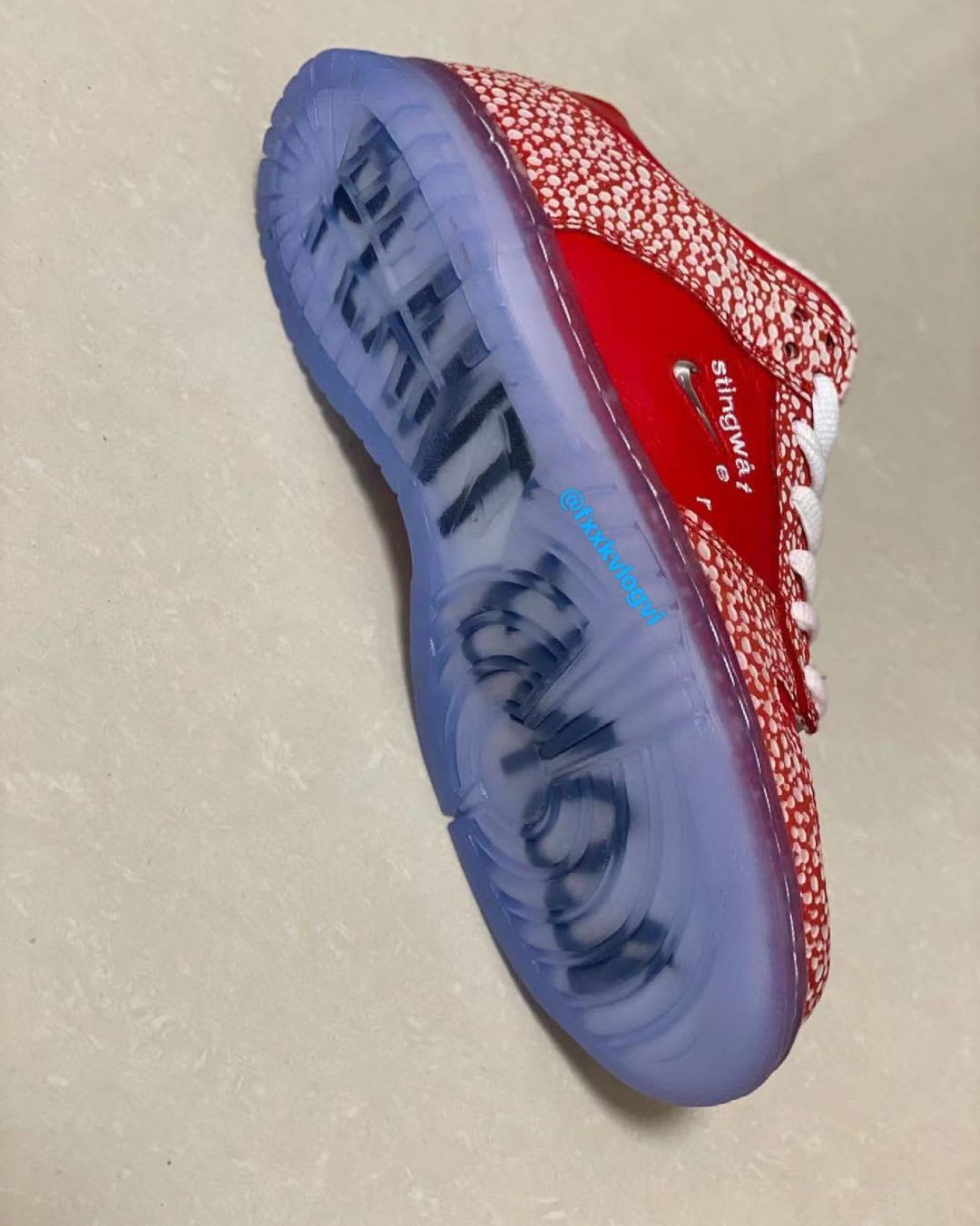 With this project, Daniel Kim’s imprint leaves its unique mark on the Nike SB Dunk Low. First-look images reveal the low-top dressed in red, with contrasting white speckles throughout. Additional details include a fat, translucent tongue, a jeweled Swoosh bearing Stingwater’s unique logo above it, blue-tinted icy soles and custom green insoles printed with “Please don’t step on me, I’m trying to GROE.”
