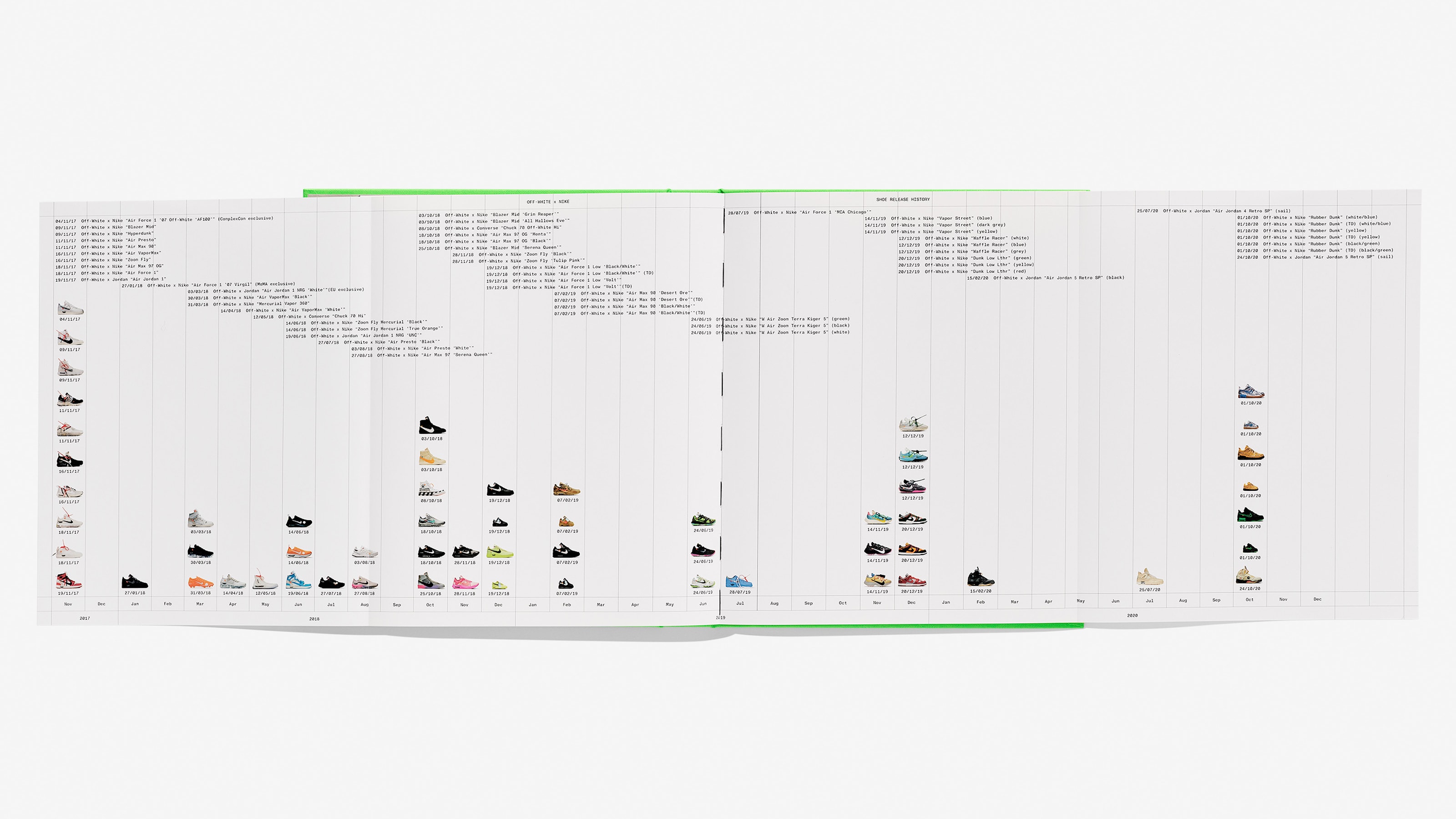 "The foundation of my practice isn’t nearly the end result — it’s rigor and process of the logic. The archive is the paper trail of those artifacts," says Abloh. "The ICONS book is, in a way, the only revealing lens to understand that the catalog of the 50-plus Nike shoes I have designed are in my mind 'one shoe.' One story."